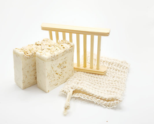 Combine the nourishing benefits of our shea butter bar soap with the stylish functionality of our artisan soap holder and soap saver bag for the ultimate self-care experience or gift for a loved one. Each gift set includes 2 bars of shea butter soap, one bamboo wood soap holder, and one natural sisal soap saver bag.